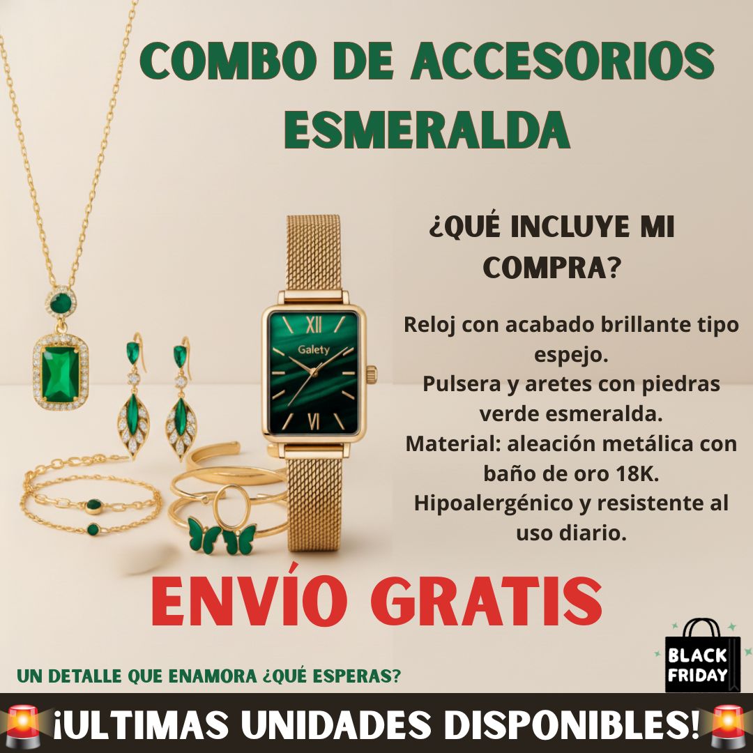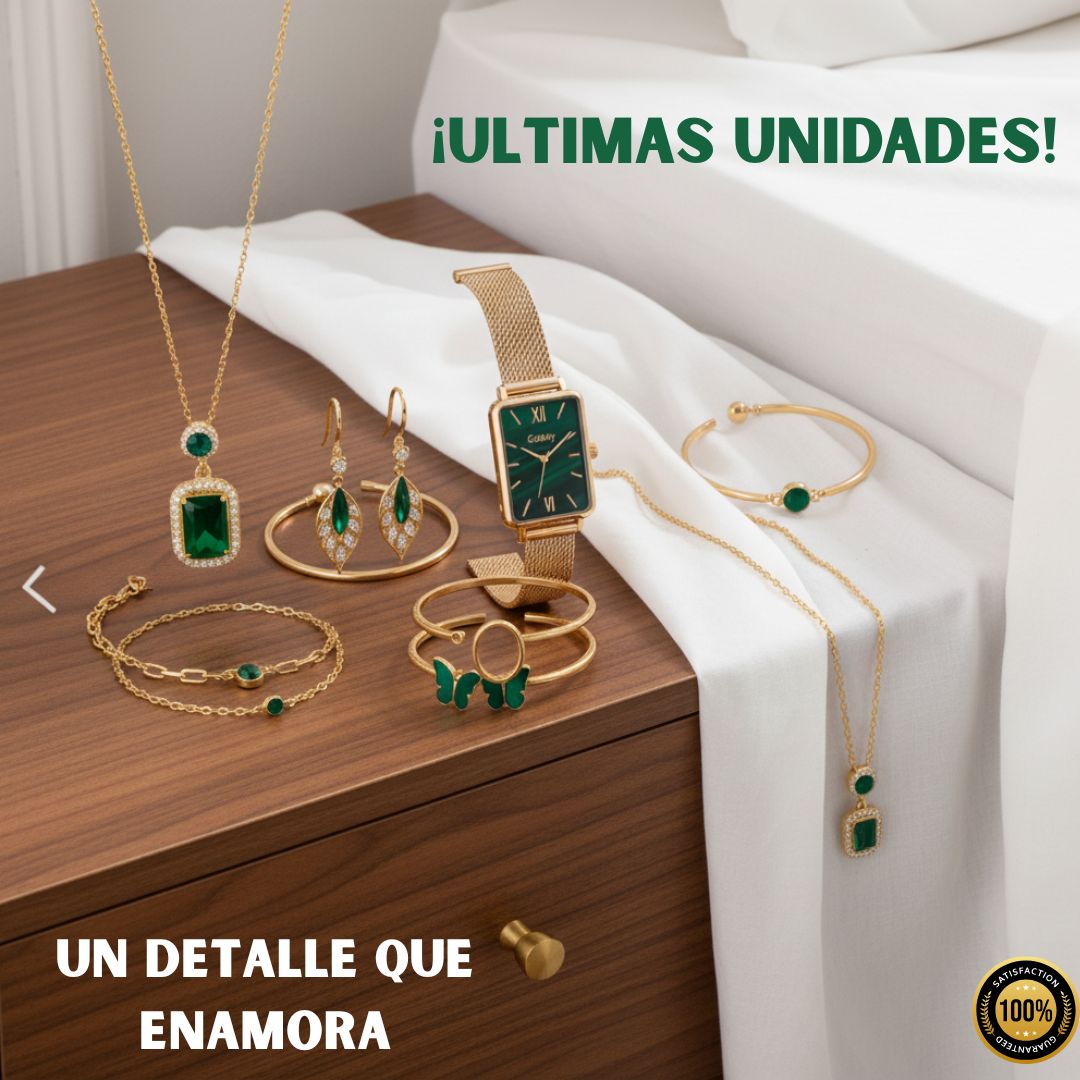 Sorprende con este elegante set de joyas y reloj de lujo a esa persona que tanto quieres. Incluye empaque premium, lista para regalar y enamorar.